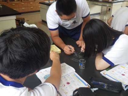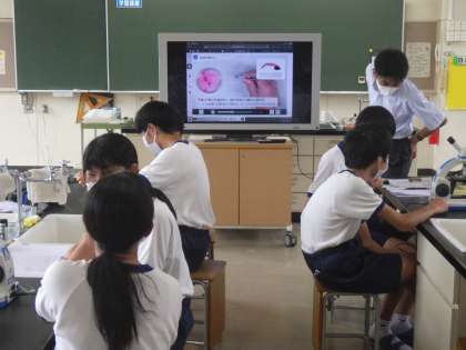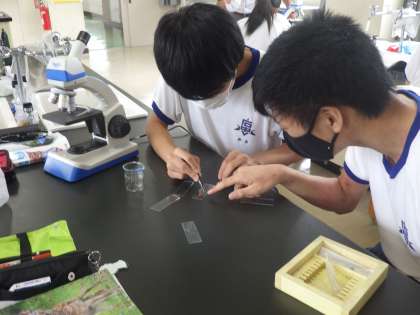 細胞分裂のときに核に起こる変化について学習していました。たまねぎの根をうすい塩酸と染色液の混合液に浸し、顕微鏡で観察していきます。ペアで協力し合って実験の準備をし、細胞の中には核以外にどんな状態のものがあるか、興味深く顕微鏡を覗き込んでいる姿が印象的でした。