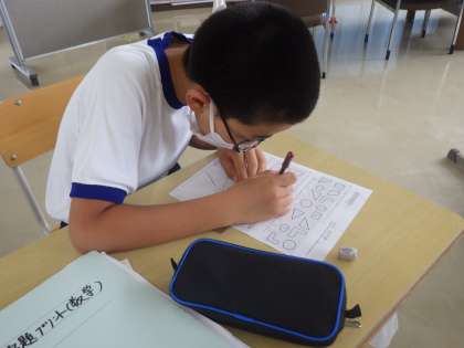各自の課題に取り組んでいました。一次関数の総復習、合同な図形など、次第に問題の難易度も上がり、量も増えていきます。