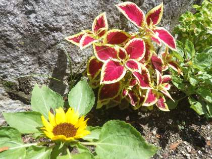 校舎の南側の花壇に植えられているヒマワリとコリウス。暑さに負けず元気に咲き、私たちにエネルギーを与えてくれる植物です。
