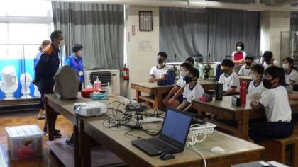 豊田市消防署力石出張所の署員や指導員の方々にお越しいただき、心肺蘇生の方法やAEDの取り扱いについて学びました。