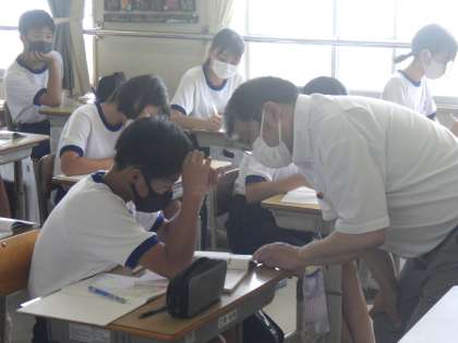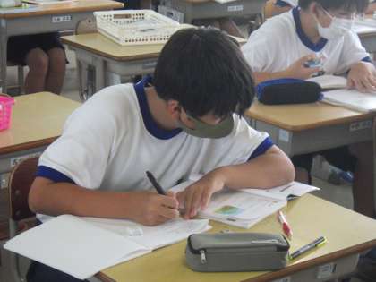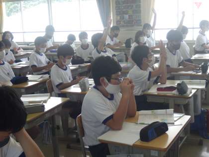 式の表す意味について考える学習に取り組んでいました。自分なりの考えを発表し、式の成り立ち、意味を理解していきます。今後、文章問題などの立式で役に立つ学習です。