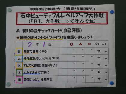夏休みを目前に学校をきれいにしようということで、「石中ビューティフルレベルアップ大作戦」の確認がなされていました。