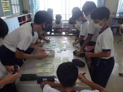 これまでに掲示されていたきらりカードを整理し、「きらり石野賞」の作成に取り組んでいました。また、本日よりスタートした「ロヒンギャ難民への募金活動」についての確認もなされていました。