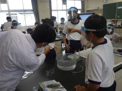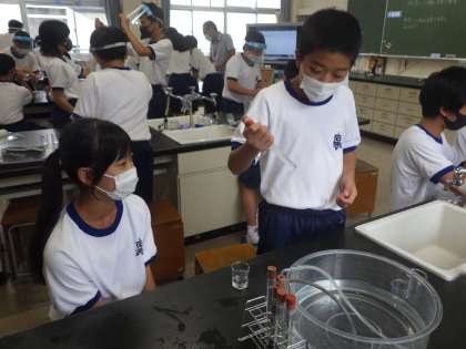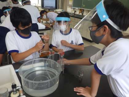 酸素と二酸化炭素の性質を調べる実験が行われていました。手順に従い、しっかりと作業を進めていきます。仲間と協力し、予想したことを確かめていきます。