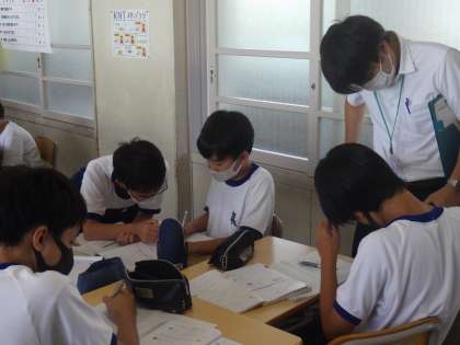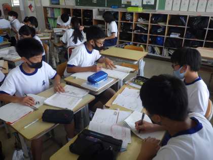 「式の値を求めよう」をテーマに多くの問題に挑戦していました。グループになり、仲間や教科担任、そして学生ボランティアからアドバイスをもらいながら、時間いっぱい積極的に問題を解いていました。