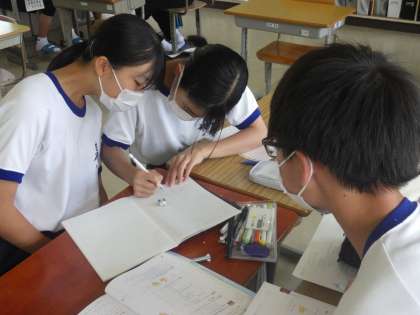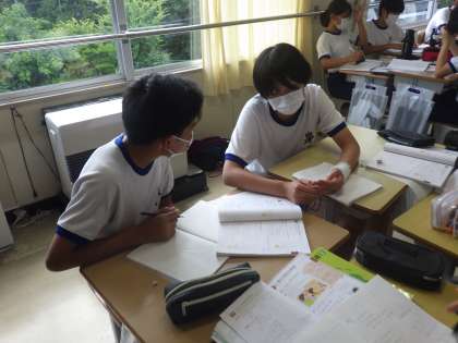 連立方程式の難しい問題に挑戦していました。まずは自分で考え、行き詰ったら相談。周りには頼りになる仲間、教科担任や学生ボランティアもいます。頑張りの様子をスクールカウンセラーさんも見守ってくれています。
