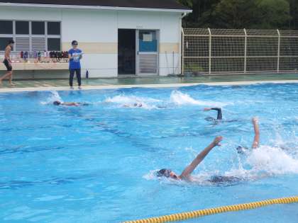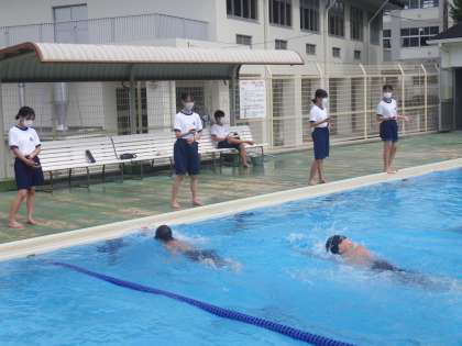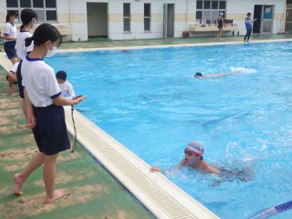 予定では午後の授業でしたが、天候に心配があったため、急きょ、1時間目に変更して行われました。これまで学習してきた泳法の確認をしつつ、タイム測定が行われていました。