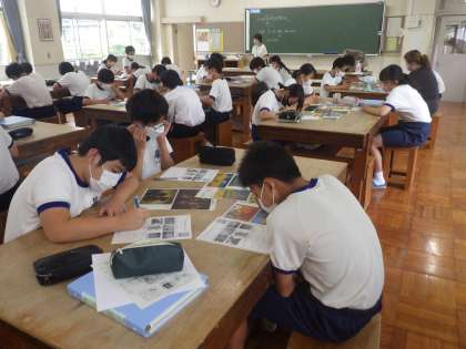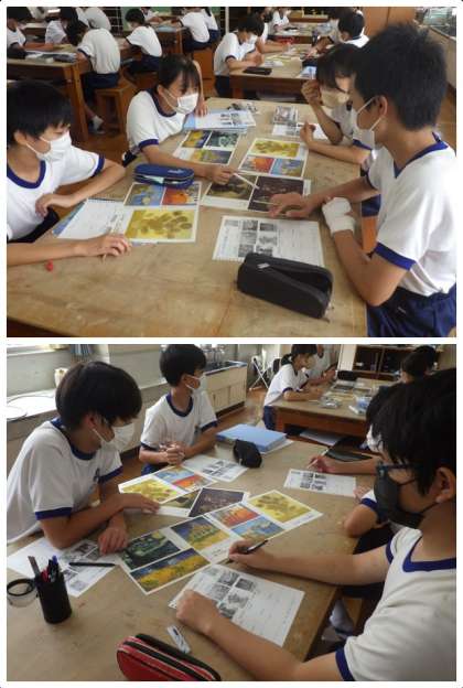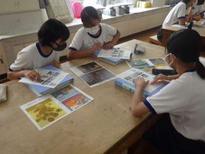 「ゴッホの想いを想像して」をテーマに、ゴッホの作品の鑑賞の学習が行われていました。鑑賞のポイントが解説され、それぞれの作品から、その時の気持ちや感情を読み取っていきます。