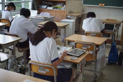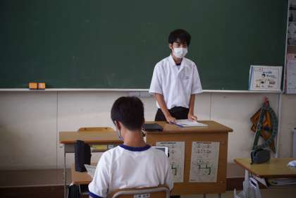 2年生は職場体験学習について、3年生は修学旅行について、それぞれが発表しました。1年生を含めた全校生徒が4つのグループに分かれ、体験したこと、それを通して思ったこと、今後の自分の生活に生かしていこうとしていることなどを発表しました。発表原稿だけでなく映像も準備し、タブレット等で流して発表していました。