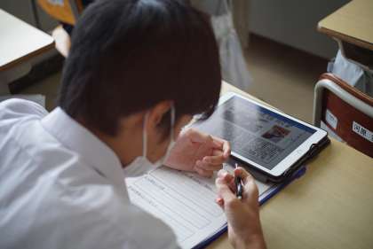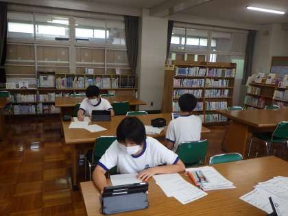 2年生は職場体験学習について、3年生は修学旅行について、それぞれが発表しました。1年生を含めた全校生徒が4つのグループに分かれ、体験したこと、それを通して思ったこと、今後の自分の生活に生かしていこうとしていることなどを発表しました。発表原稿だけでなく映像も準備し、タブレット等で流して発表していました。