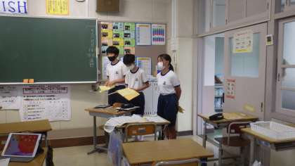 2年生は職場体験学習について、3年生は修学旅行について、それぞれが発表しました。1年生を含めた全校生徒が4つのグループに分かれ、体験したこと、それを通して思ったこと、今後の自分の生活に生かしていこうとしていることなどを発表しました。発表原稿だけでなく映像も準備し、タブレット等で流して発表していました。