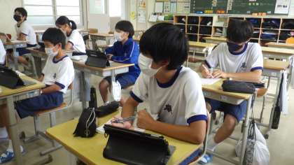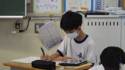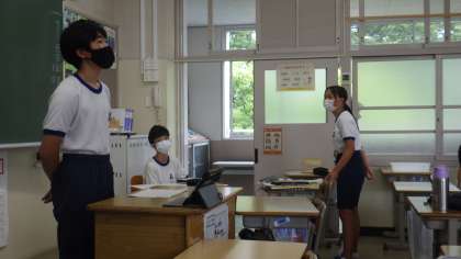2年生は職場体験学習について、3年生は修学旅行について、それぞれが発表しました。1年生を含めた全校生徒が4つのグループに分かれ、体験したこと、それを通して思ったこと、今後の自分の生活に生かしていこうとしていることなどを発表しました。発表原稿だけでなく映像も準備し、タブレット等で流して発表していました。
