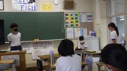2年生は職場体験学習について、3年生は修学旅行について、それぞれが発表しました。1年生を含めた全校生徒が4つのグループに分かれ、体験したこと、それを通して思ったこと、今後の自分の生活に生かしていこうとしていることなどを発表しました。発表原稿だけでなく映像も準備し、タブレット等で流して発表していました。