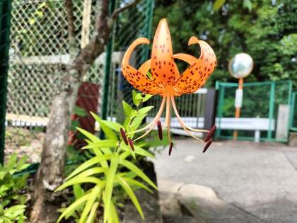 正門付近に一輪だけ咲くオニユリを見つけました。以前にもこのホームページで「零余子(むかご)」について紹介した時の植物がオニユリです。