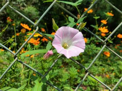 自生するアサガオを発見しました。学校周りのフェンスにツルを巻き付け、きれいに花を咲かせています。