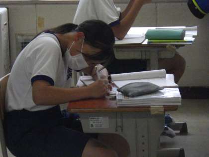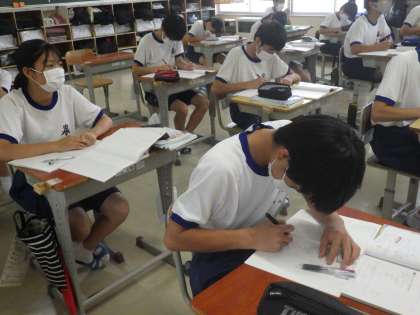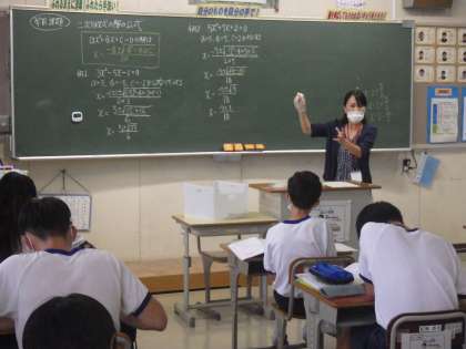 2時間続きで行われ、前半はこれまで学習した内容を確認するためのテスト、後半が二次方程式の公式を使っての解の求め方の学習です。集中力が途切れることなく、真剣に取り組んでいました。