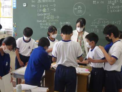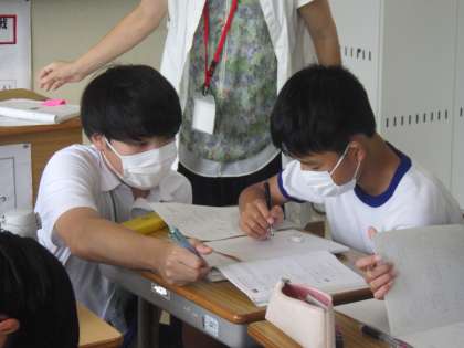 連立方程式の代入法について解き方の確認のため、たくさんの問題を解いていました。教科担任や仲間のアドバイスはもちろん、学生ボランティアにも積極的にアドバイスをもらって学習しています。夏休み中の家庭での一人での勉強に向け、追い込みをかけているようでした。