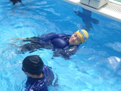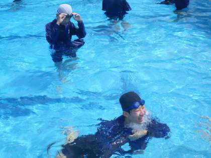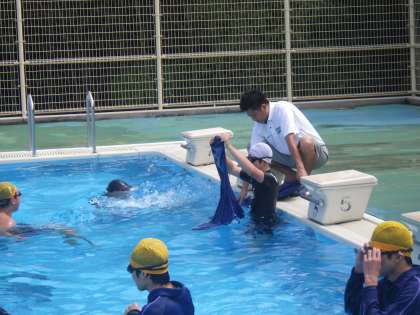 義務教育最後の水泳の授業となった今日は、着衣泳が行われていました。服を着たままで浮かぶことがどれだけ大変かを体験しています。そして、どうしたら浮くことができるか、脱いだ服やズボンを使って浮袋をつくる練習もしていました。