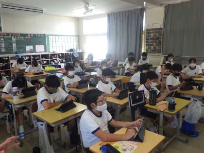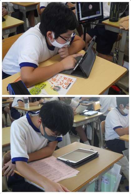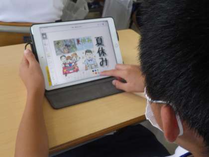 タブレットを使って夏休みの課題や出校日などの確認が行われていました。