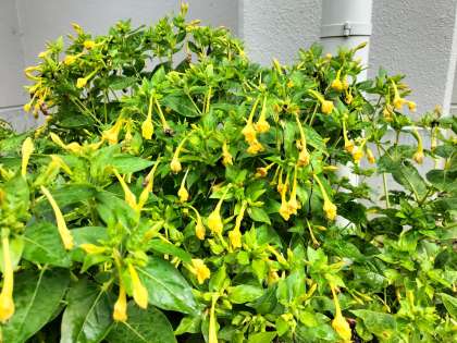 体育館の南側の花壇で育つオシロイバナ。夕方に赤や黄色、紫色などをした香りのいい花を咲かせる多年草です。秋に実る黒い種から出る白い粉を使って、遊んだ記憶があります。