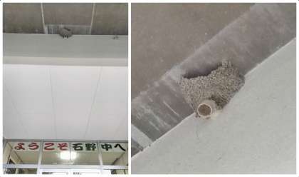 これまでに何度も紹介してきたツバメに関する記事。校内をよく観察してみると、正面がん間の軒下にも、立派なツバメの巣があることに気がつきました。毎日、何度も出入りしているはずの玄関でしたが、全く気がつきませんでした。