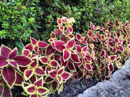 暑さに負けず、正門付近のロータリーの花壇では、コリウスが今年は元気に育ち続けています。