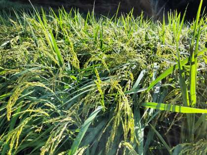 石中田の石農米の様子です。つい先日まではピンと立っていた穂先も、次第に下がってきています。今のところ台風やイノシシなどの被害もなく、順調に成長しています。