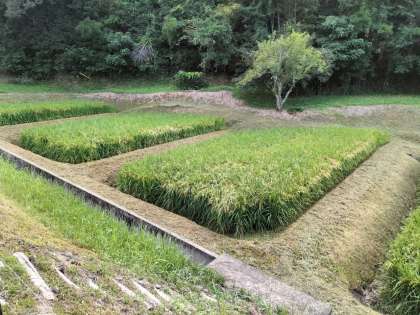 緑色の中にだんだんと色好き始め、首を垂れる穂先が目立つようになってきた石農米。また、米づくりに師匠によって田んぼの周りの雑草もかられ、石農米の成長がより分かるようになりました。