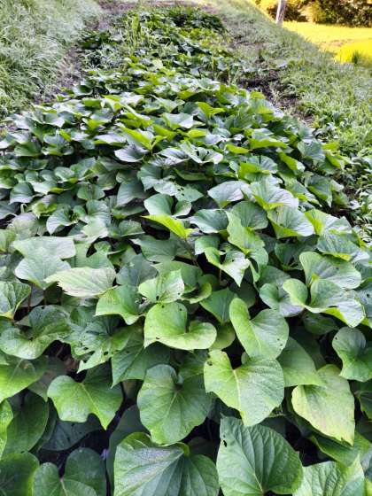 石中田の横にある4組の学級菜園。毎日、夏の強い日差しをいっぱい浴びて、サツマイモがすくすくと成長しています。石農米とあわせて、秋の収穫時期が今から楽しみです。