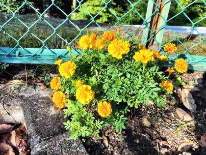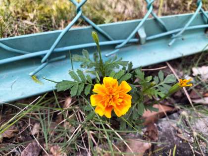 正門付近のフェンスの片隅に、一株だけしっかりと咲くマリーゴールドがあります。これは自生したもので、花壇に植得られている他のマリーゴールドよりも立派に花を咲かせています。