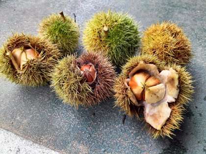見事なサイズの栗が、完熟する前に少しずつ落ちていました。中にはイガが自分から割れ、中が見えるものもありました。