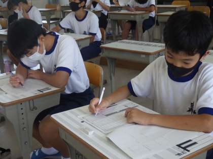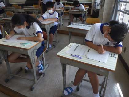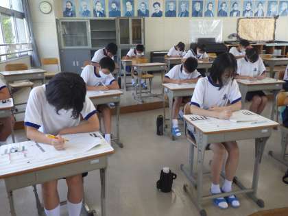 夏休みの課題提出のあと、担任から残り10日間の夏休みの過ごし方、健康管理について話がありました。その後、数学の確認テストが行われていました。