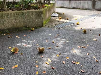 校舎北側の職員駐車場付近にある栗の木。毎年この木からは、栗の実が膨らむ前に落ちてしまうことがよくあります。しかし、落ちたものをよく見てみると、今年はまあまあの出来のものが落ちています。ちょっともったいない気もしますが、でもまだ早いかな…?