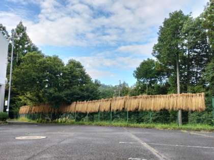 夏休み終了間近に刈られた石農米の稲がフェンスに掛けられ、秋の石中の風景を見ることができます。