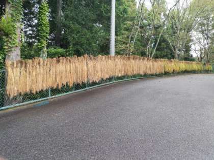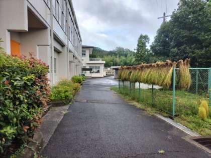 昨日刈り取ったうるち米を学校まで持ち込み、やる気満々の先生たちの協力もあり、はざかけが手際よく行われました。