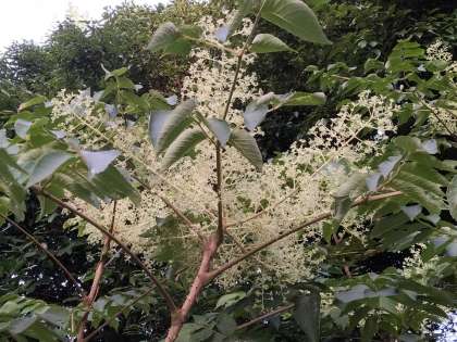 あいさつの坂道の中腹に、幹の先端に大きな花序を広げて、淡い緑白色の花を多数つけるタラノキを見つけました。遠くからでも良く目立っています。