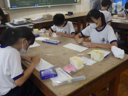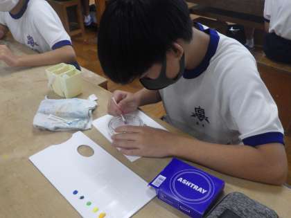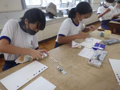 サンドブラスト加工によるガラス製品作りの色付けの工程に移っていました。丁寧に彫られた自身の作品に、どんな色をどのようにつけていくか。作業の確認をしつつ、黙々と色付けに取り組んでいました。