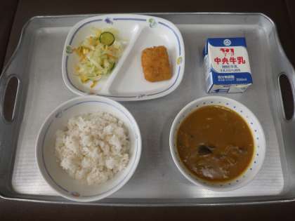 今日の献立は、夏野菜のカレー(麦ごはん)、サワーキャベツ、たらフライ、牛乳 でした。 エネルギー:905kcal