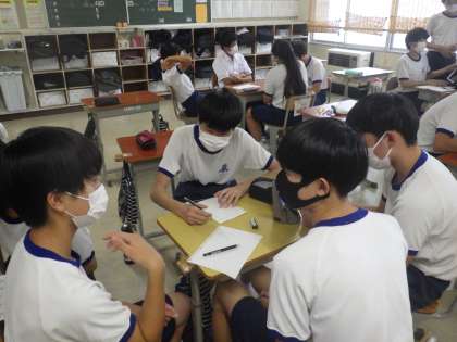 後期に向けての新たな学級組織づくりが始まっていました。各係ごとに分かれ、クラス・学年としてやるべきこと、学校全体にアピールしていくことなどの意見交換が行われていました。