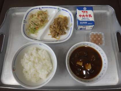今日の献立は、「豊田ブランドの日」献立ということで、なすのみそ汁、ごぼうサラダ、ひまわりポークのしょうが炒め、ももゼリー、ごはん、牛乳 でした。 エネルギー:803kcal