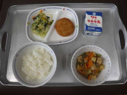 今日の献立は、高野豆腐のうま煮、菊花あえ、さといもコロッケ、ごはん、牛乳 でした。  エネルギー:859kcal