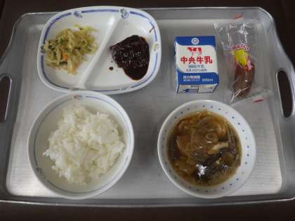 今日の献立は、「月見献立」ということで、のっぺい汁、野菜のねりごまあえ、さばのみそ煮、月見だんご、ごはん、牛乳 でした。 エネルギー:844kcal