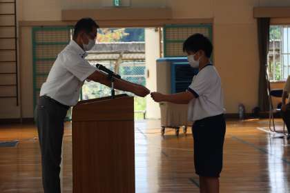 講座の冒頭では、石野防災ボランティア隊(通称:JBV「ジュニア防災ボランティア」)の入隊式が行われ、校長先生より今年度入隊となった1年生の代表生徒に隊員証が渡されました。参列いただいた区長様方から、期待の込められた大きな拍手が送られました。