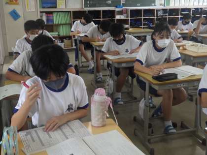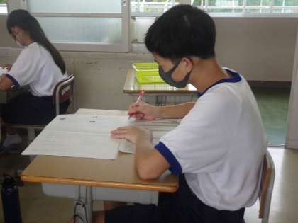 前期期末テストの返却とその解説が行われていました。理解が不十分だったところを補い、しっかりできていたところは今後も維持できるよう、今後に活かせる学習に励んでもらいたいと思います。