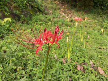 昨日、全校での稲刈りを終え、石中田も少し寂しい感じになりました。ただ、その片隅には、この時期の花・ヒガンバナが咲き始めていました。これを見ると、小学生の頃に習った「ごんぎつね」の国語の教科書のイラストを思い出します。