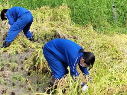 本日、全校稲刈りが行われました。深夜に降った雨で、畦の草の露や田のぬかるみに苦しめられましたが、暑さや腰の痛さにも耐え、限られた時間内で見事、すべての稲を刈り取ることができました。