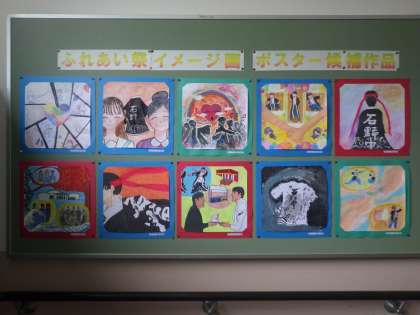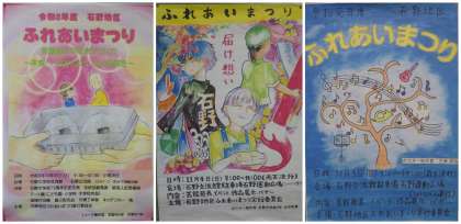 夏休みに生徒たちが作成してくれた「石野地区ふれあいまつり」のポスターの原画。歴代のポスターに仲間入りするのはどの作品になるでしょうか?