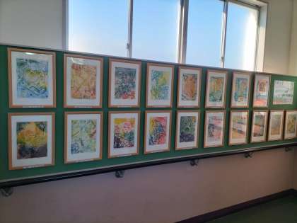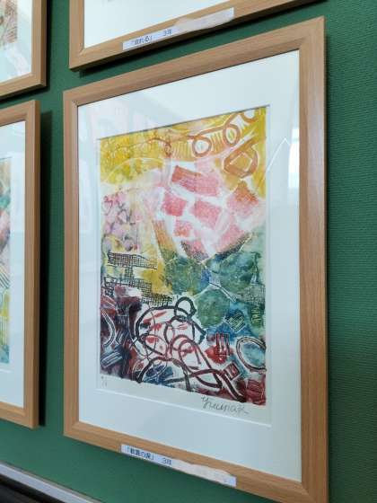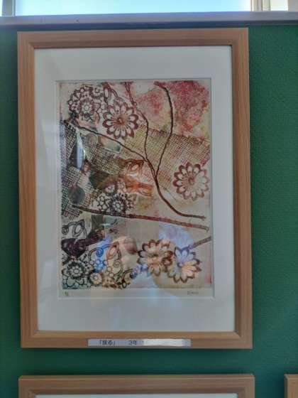 校舎東階段の踊り場に、生徒が美術で政策に取り組んだ作品が展示されています。新たに作品ギャラリーに加わったのは、3年生の「コラグラフ版画」の作品です。どれも力作ぞろいで見とれてしまいます。