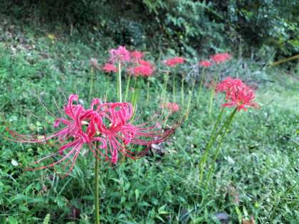 稲刈りを終えた石中田のそばの一角で、ヒガンバナがきれいに咲いています。周りの緑の中で赤く咲く花は、ひときわ目立っています。(今日の「花と花言葉」でも紹介)