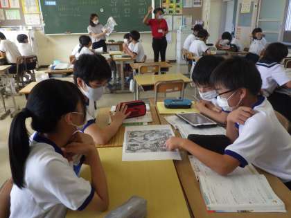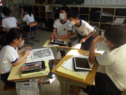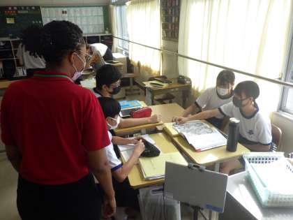 「日本語で分かっていてもなかなか英語で表現できない」、「単語は出てくるけど、しっかりとした分法で表現できない」などのつまづきに対して、ALTや教科担任がサポートに入ります。また、仲間のアドバイスもあり、ゲームを楽しみつつ、繰り返し基本文を練習していました。